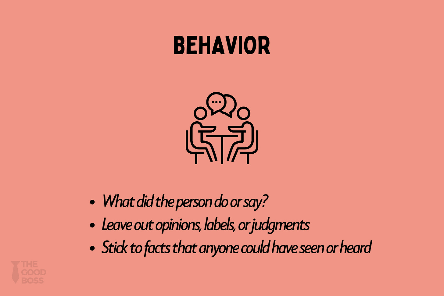 👉🏼 Takeaway: Those are judgments, not behaviors. Note that people can’t correct a judgment, only an action.