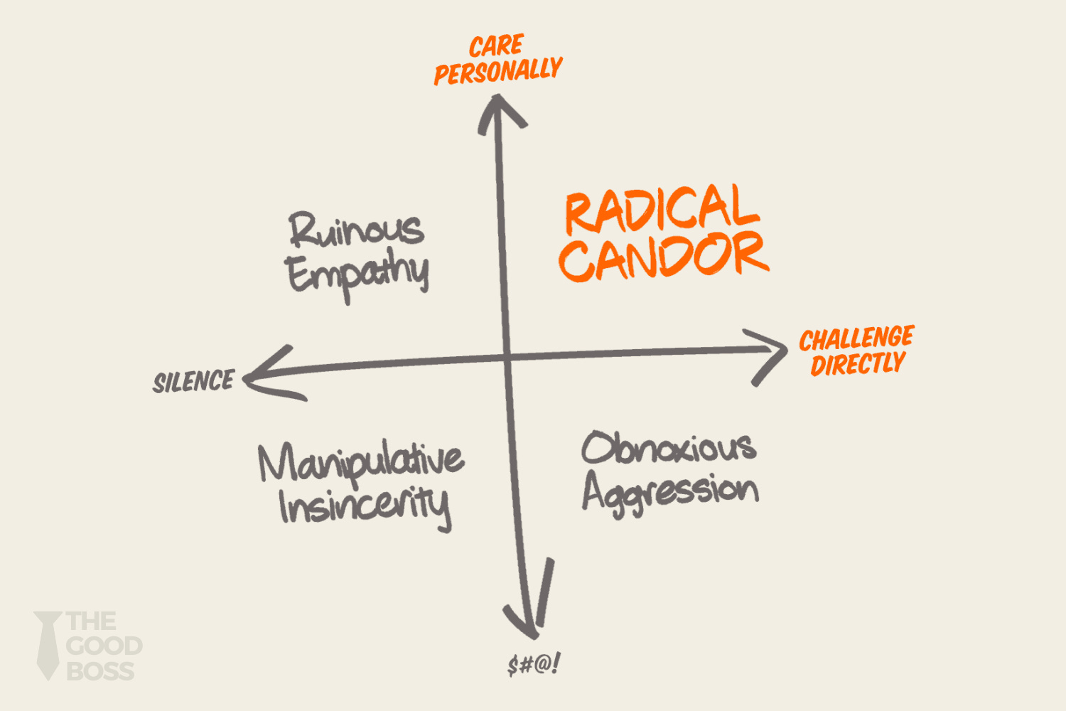 Kim Scott, a former executive at Google and Apple, wrote a book on Radical Candor, where she emphasizes the importance of caring personally while challenging directly. Check out Radical Candor: How to Be Direct Without Being an Asshole to learn more about the framework, including application strategies.