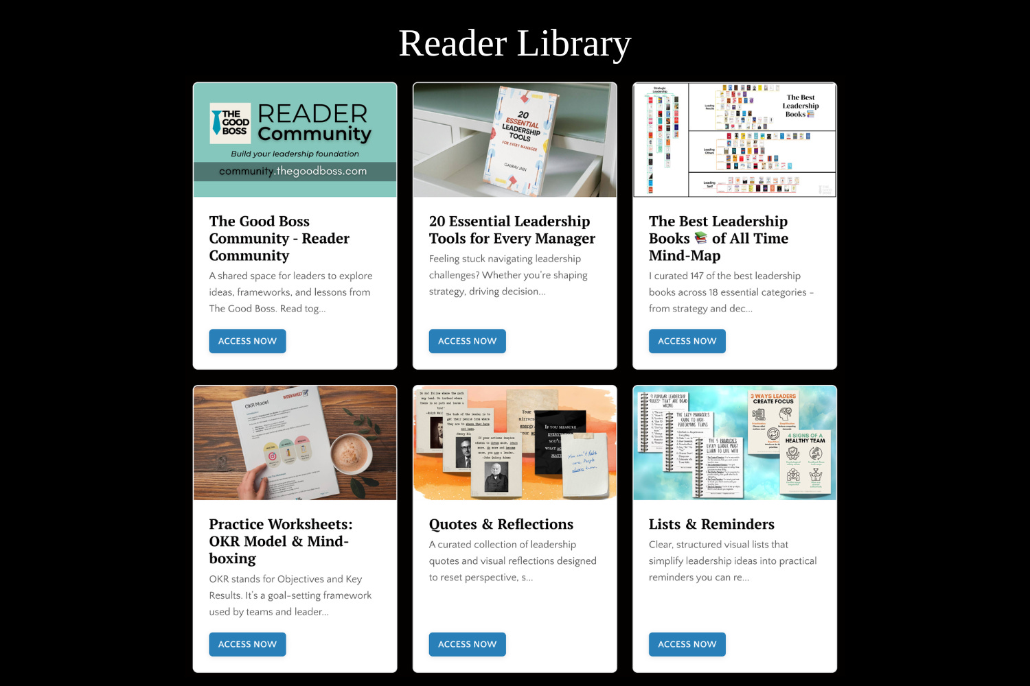 All free subscribers to The Good Boss are part of The Good Boss Reader ecosystem. As a Reader, you have free access to a host of resources and tools hosted in your Reader Resource Library.