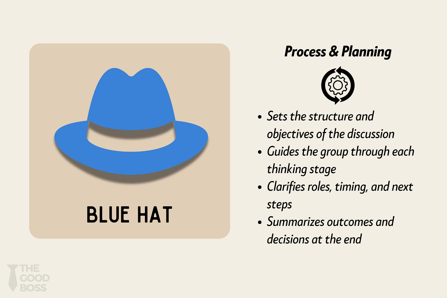 When you’re wearing the Blue Hat, you decide which hat to wear next, how long to spend in each mode, and how to summarize outcomes.