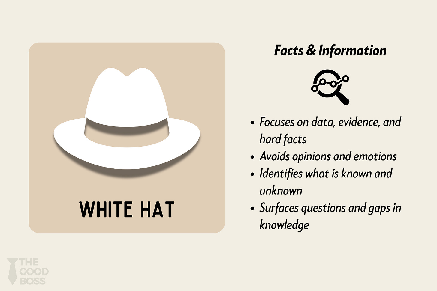 This hat strips away opinions, assumptions, and emotions. When your team wears the White Hat, the goal is simple: to surface objective facts, measurable data, and observable trends. It’s the hat of clarity.