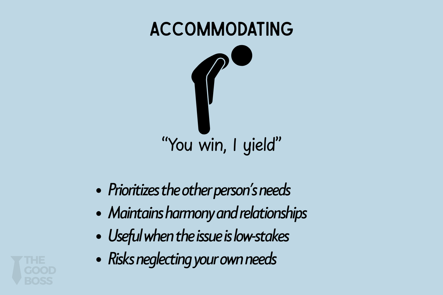 Accommodating (Low Assertiveness, High Cooperativeness). You give in. You let the other person have their way.