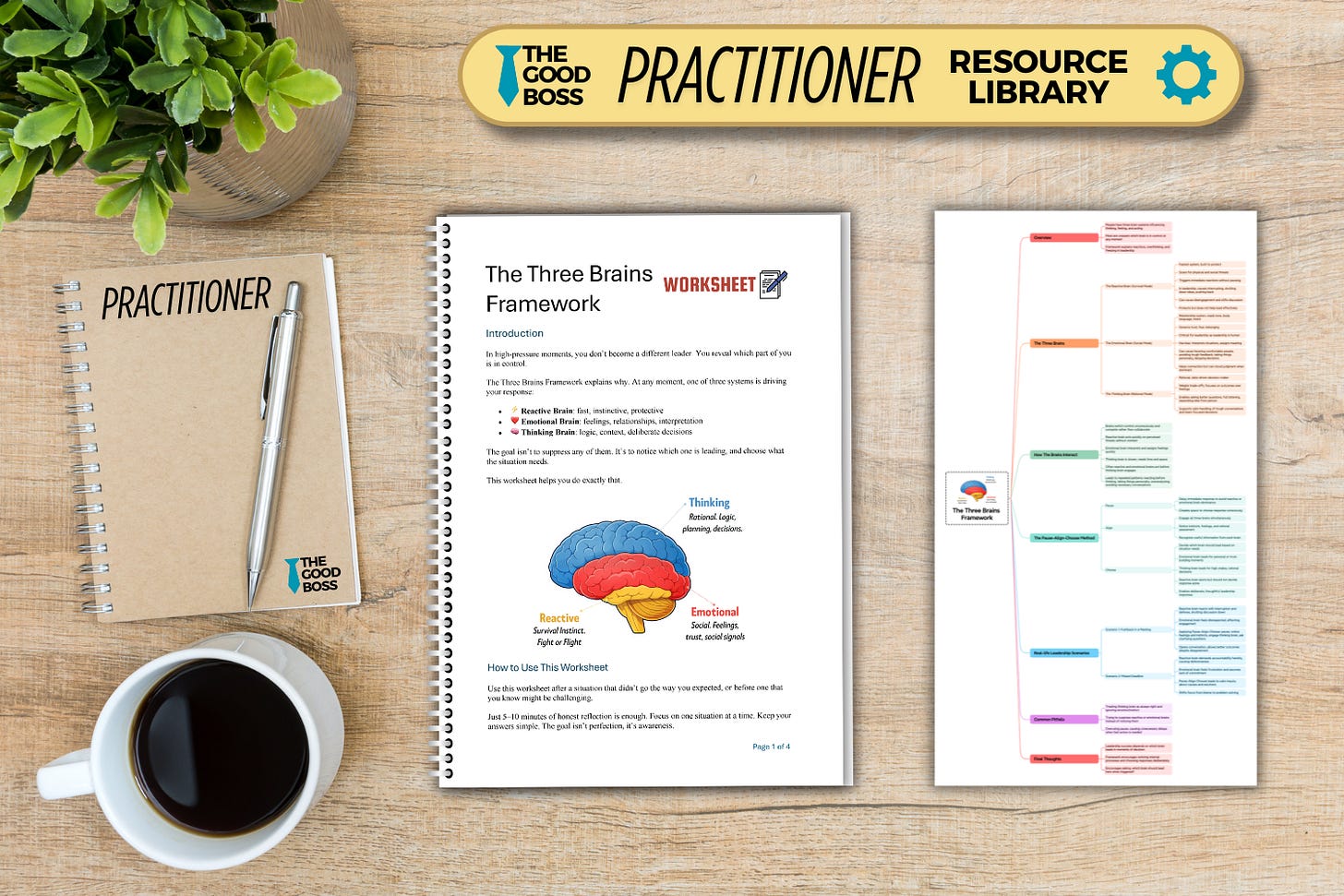The Three Brains Worksheet and Mind-map: Make it real with step-by-step prompts, and a visual map, to help you apply this framework in your situation.